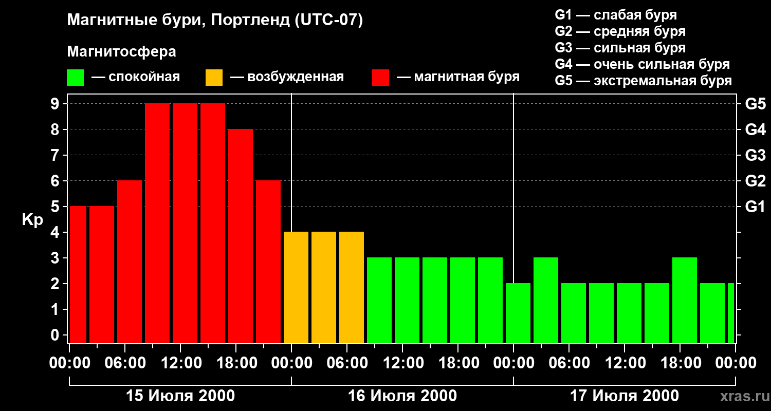 Изменения геомагнитного индекса Kp с 15 по 17 июля 2000 года для средних широт