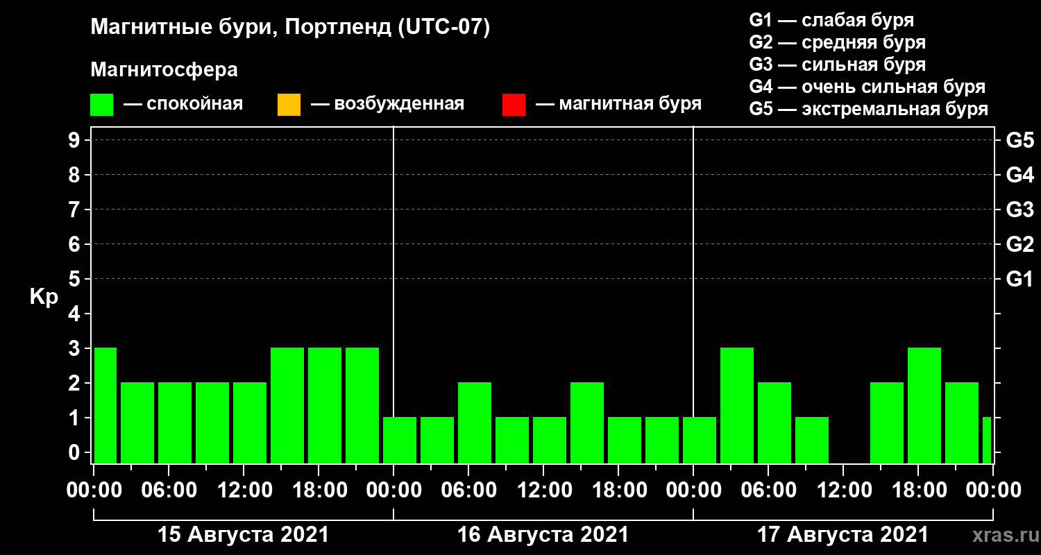 Изменения геомагнитного индекса Kp с 15 по 17 августа 2021 года для средних широт