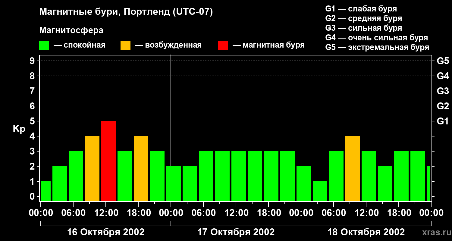 Изменения геомагнитного индекса Kp с 16 по 18 октября 2002 года для средних широт