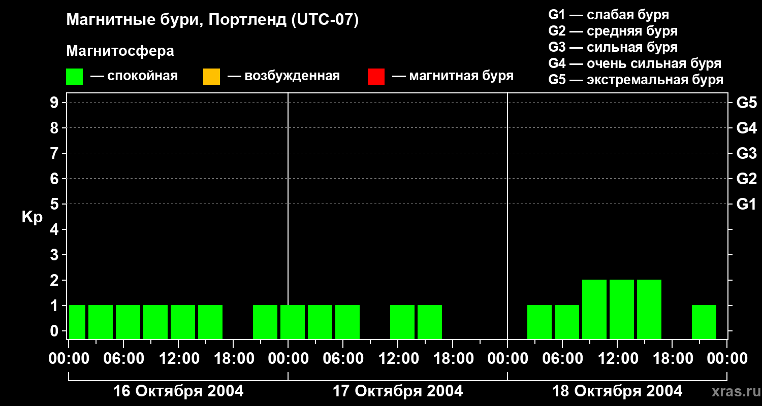Изменения геомагнитного индекса Kp с 16 по 18 октября 2004 года для средних широт