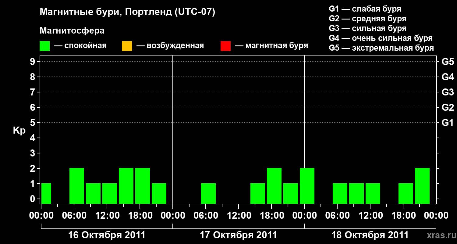 Изменения геомагнитного индекса Kp с 16 по 18 октября 2011 года для средних широт