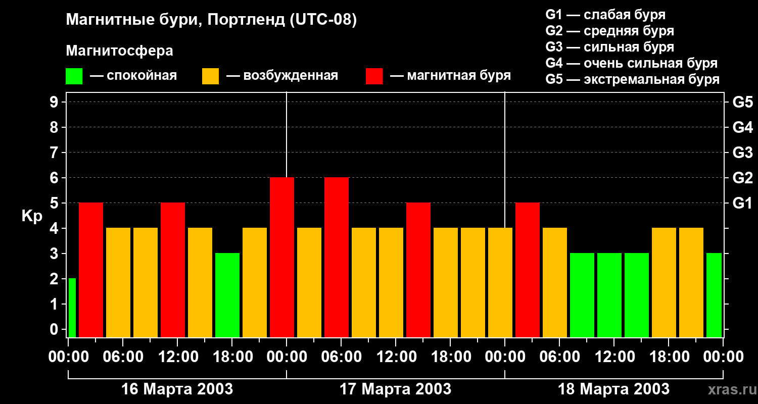 Изменения геомагнитного индекса Kp с 16 по 18 марта 2003 года для средних широт