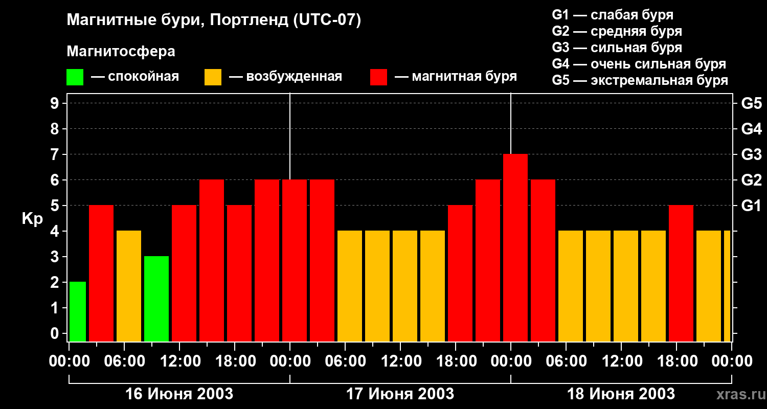 Изменения геомагнитного индекса Kp с 16 по 18 июня 2003 года для средних широт