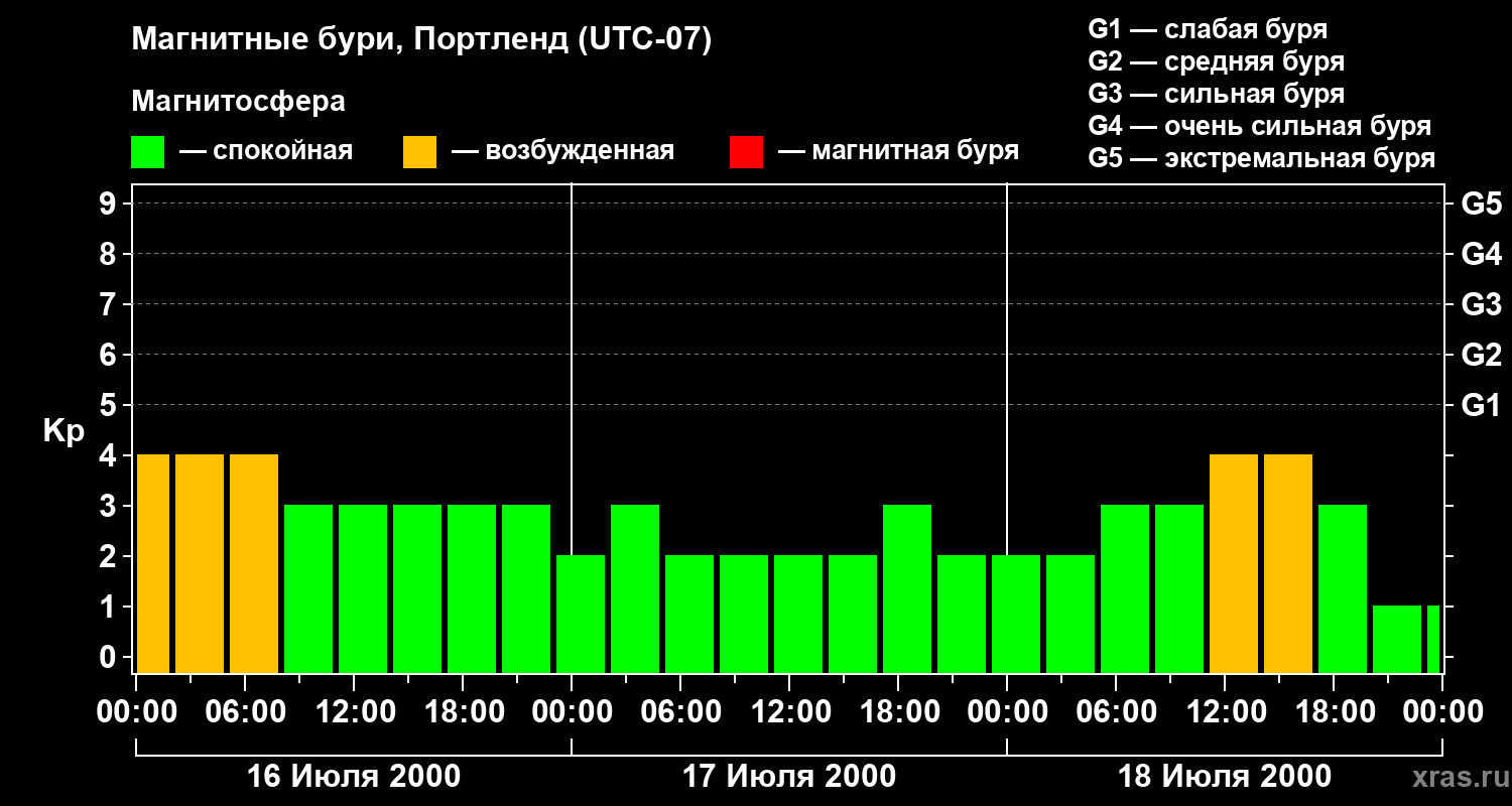 Изменения геомагнитного индекса Kp с 16 по 18 июля 2000 года для средних широт