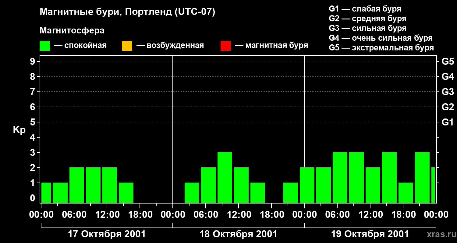 Изменения геомагнитного индекса Kp с 17 по 19 октября 2001 года для средних широт