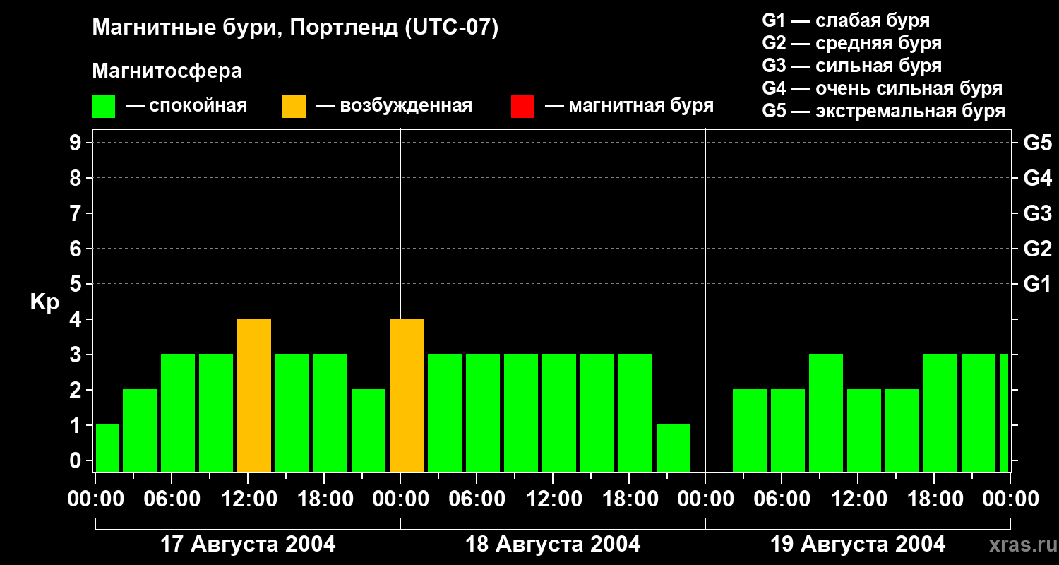 Изменения геомагнитного индекса Kp с 17 по 19 августа 2004 года для средних широт