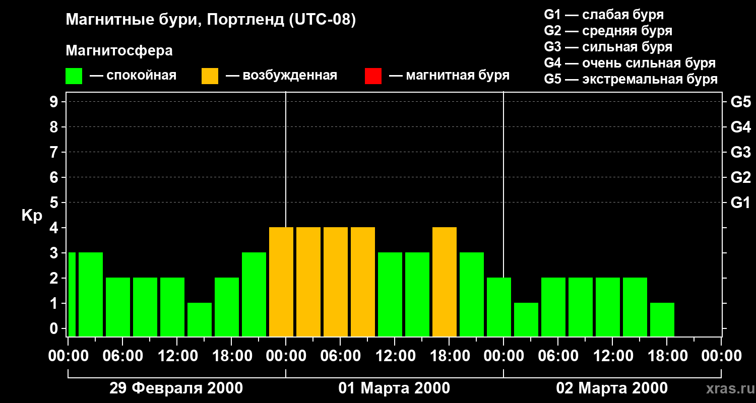 Изменения геомагнитного индекса Kp с 29 февраля по 2 марта 2000 года для средних широт