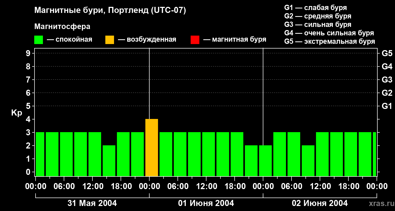 Изменения геомагнитного индекса Kp с 31 мая по 2 июня 2004 года для средних широт
