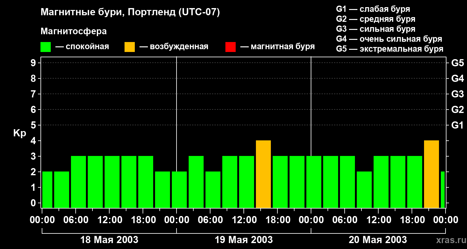 Изменения геомагнитного индекса Kp с 18 по 20 мая 2003 года для средних широт