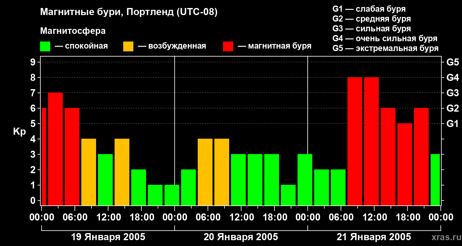 Изменения геомагнитного индекса Kp с 19 по 21 января 2005 года для средних широт