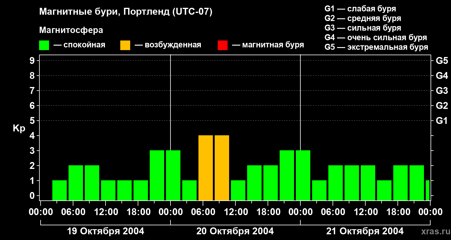 Изменения геомагнитного индекса Kp с 19 по 21 октября 2004 года для средних широт