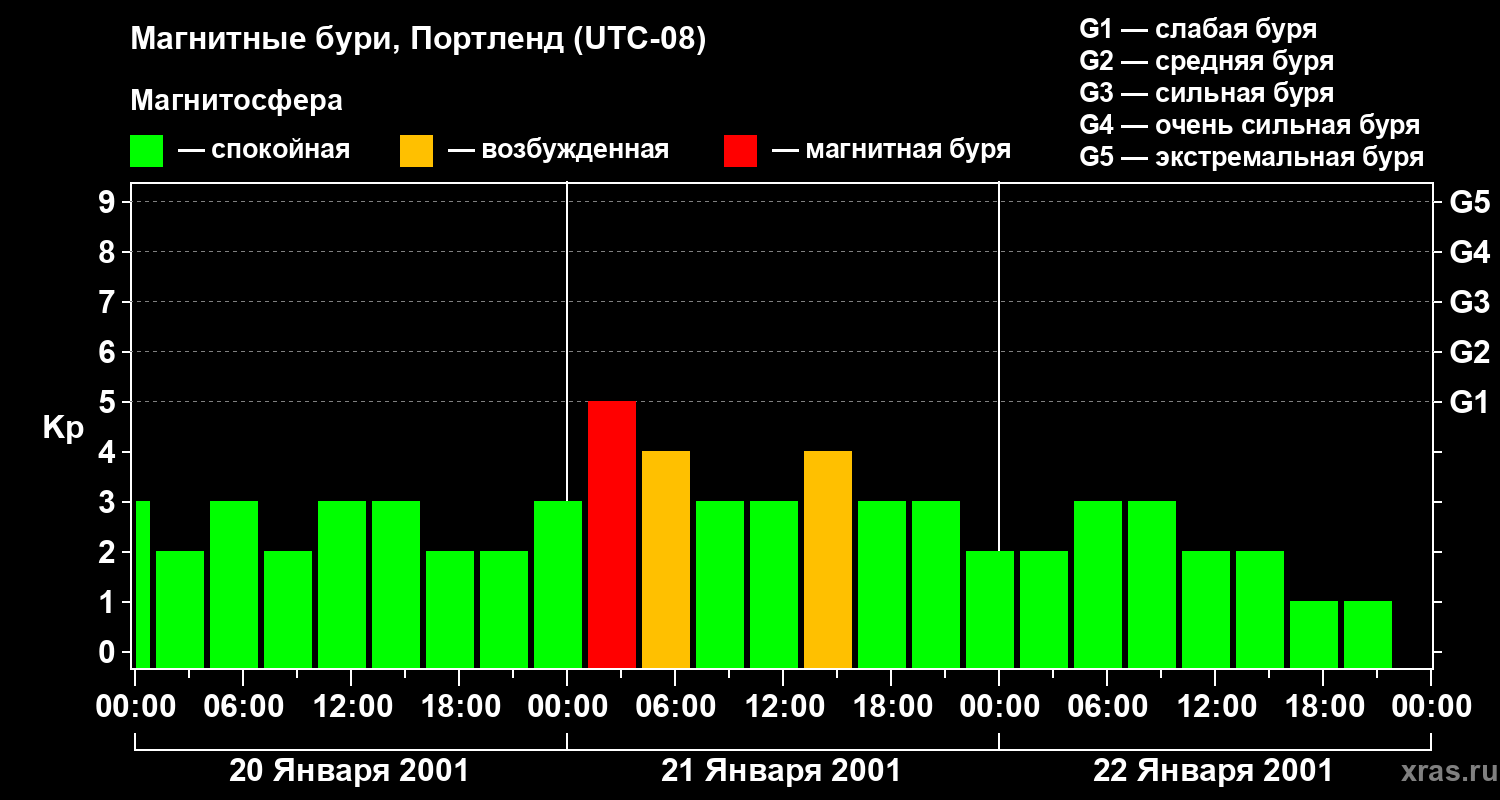 Изменения геомагнитного индекса Kp с 20 по 22 января 2001 года для средних широт
