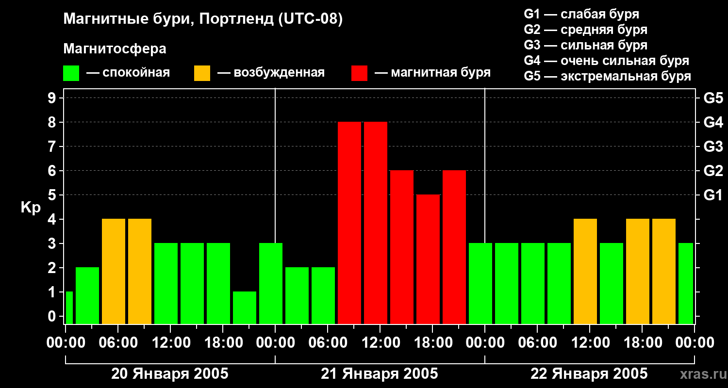 Изменения геомагнитного индекса Kp с 20 по 22 января 2005 года для средних широт