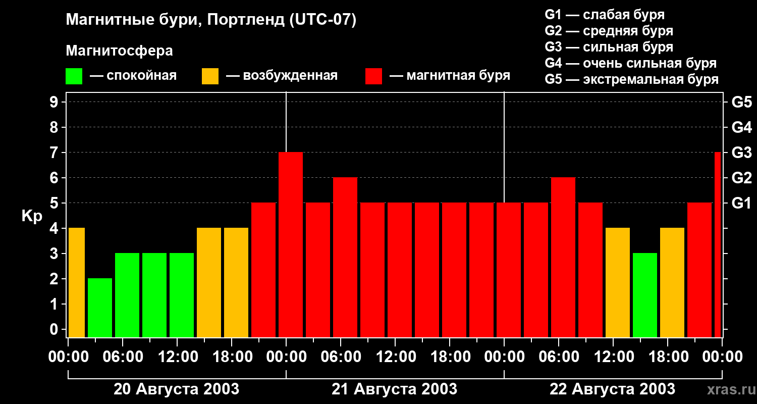 Изменения геомагнитного индекса Kp с 20 по 22 августа 2003 года для средних широт