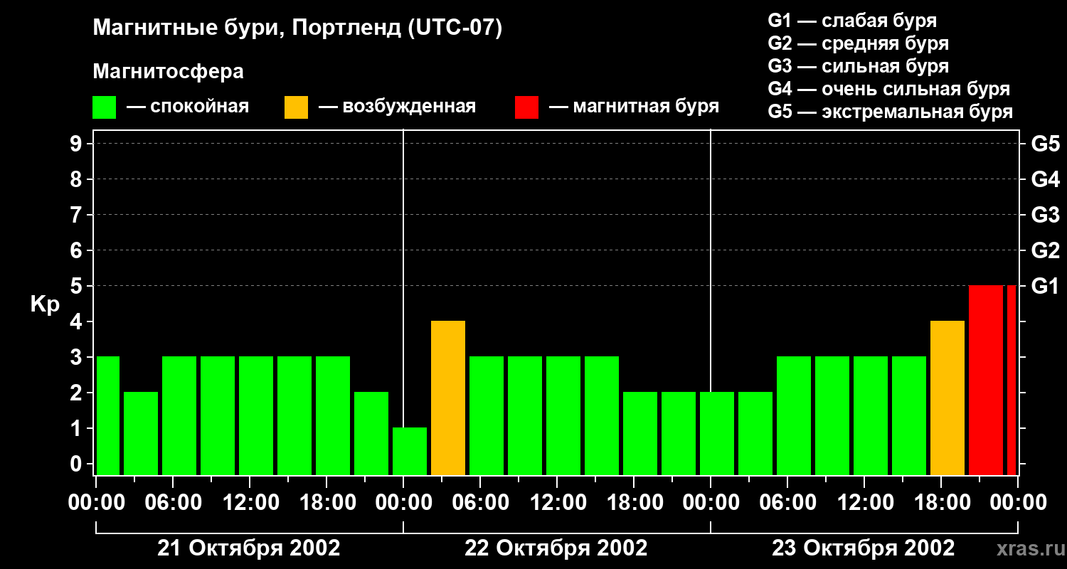 Изменения геомагнитного индекса Kp с 21 по 23 октября 2002 года для средних широт