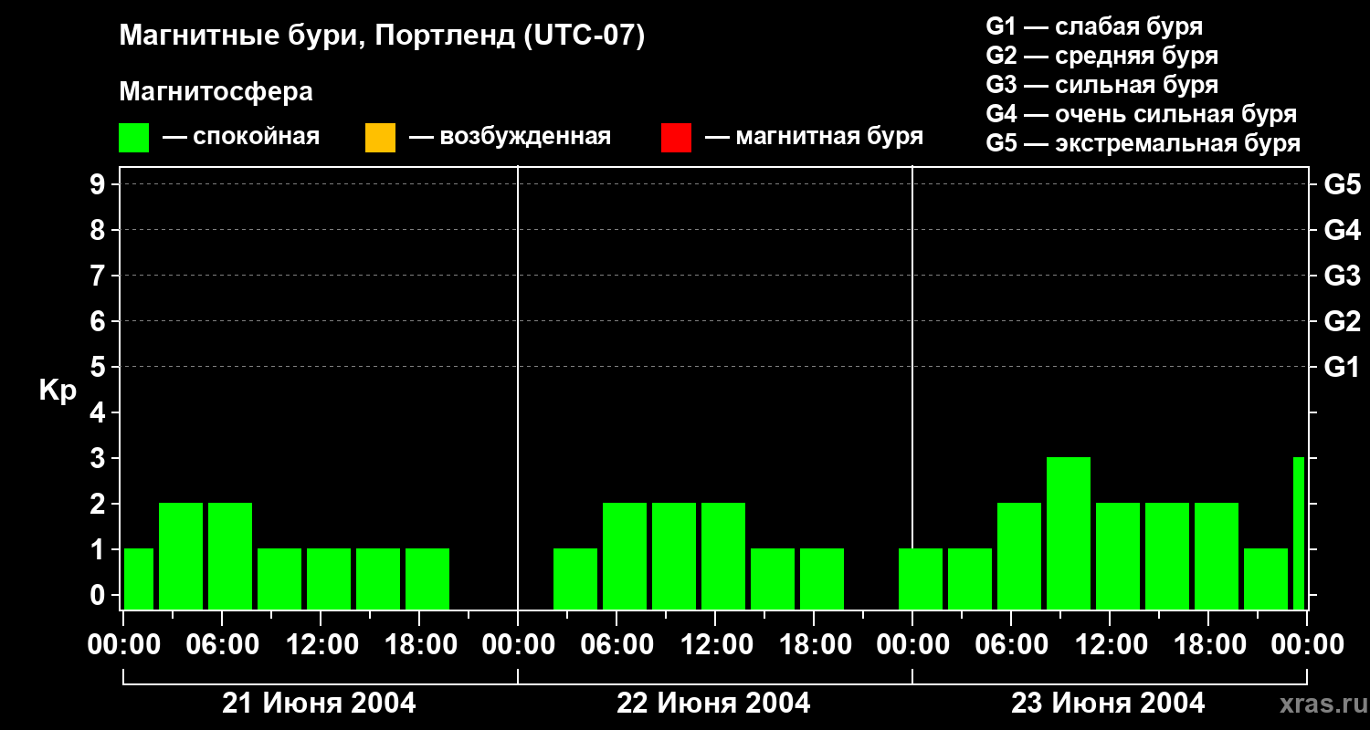 Изменения геомагнитного индекса Kp с 21 по 23 июня 2004 года для средних широт