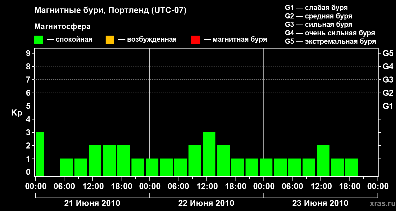Изменения геомагнитного индекса Kp с 21 по 23 июня 2010 года для средних широт