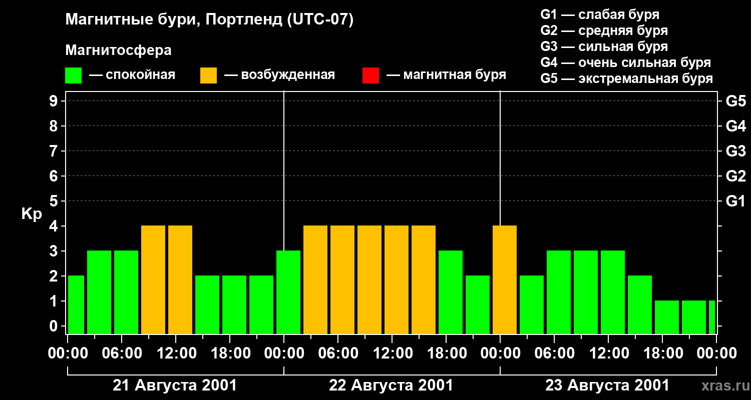 Изменения геомагнитного индекса Kp с 21 по 23 августа 2001 года для средних широт