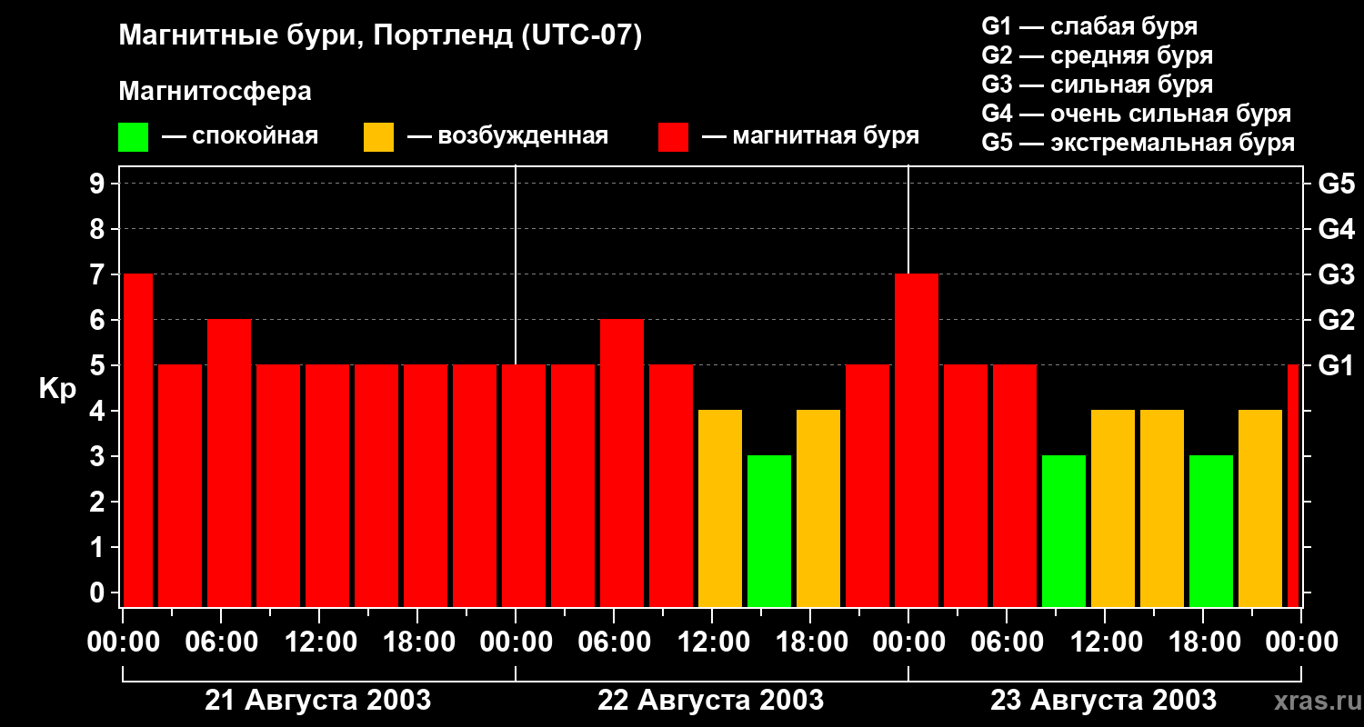 Изменения геомагнитного индекса Kp с 21 по 23 августа 2003 года для средних широт