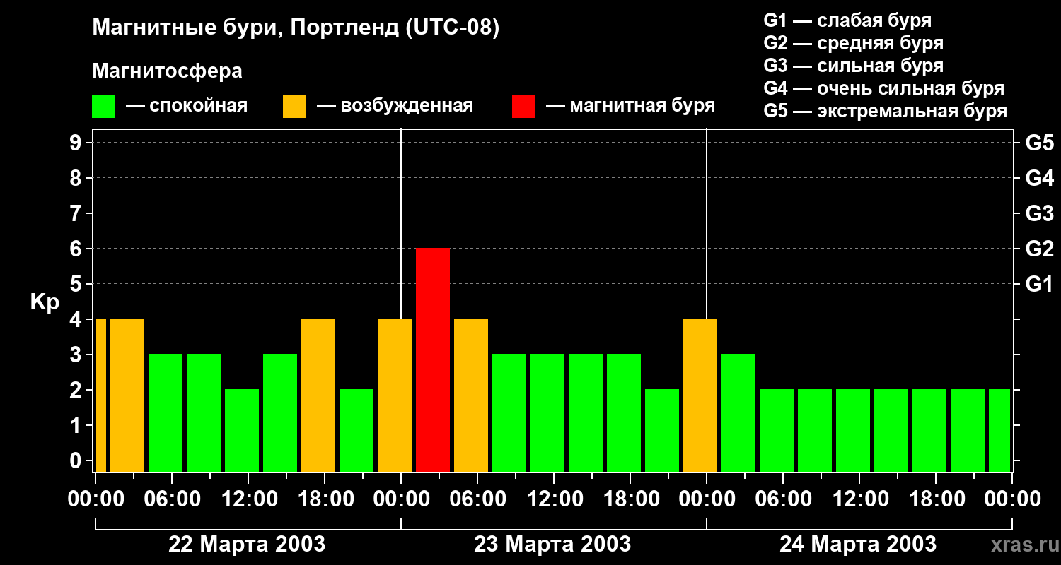 Изменения геомагнитного индекса Kp с 22 по 24 марта 2003 года для средних широт