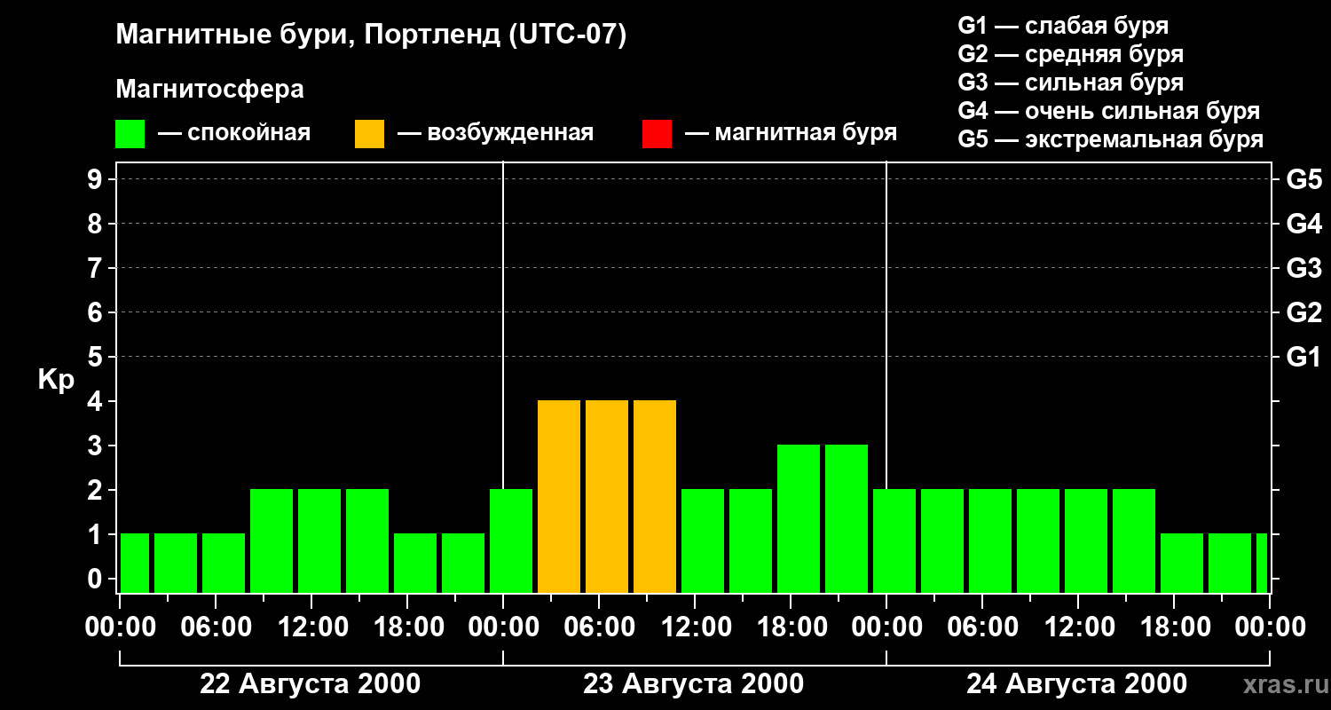 Изменения геомагнитного индекса Kp с 22 по 24 августа 2000 года для средних широт