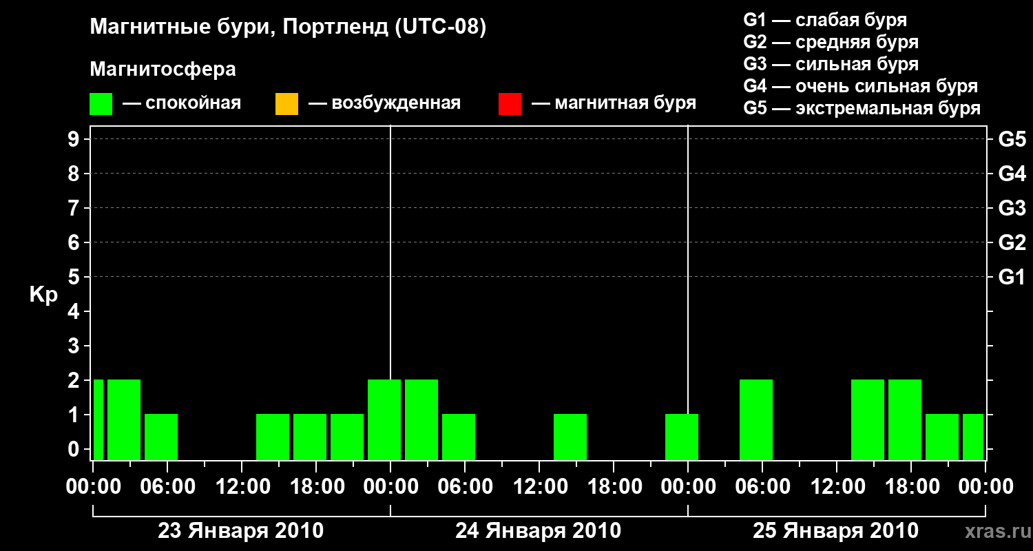 Изменения геомагнитного индекса Kp с 23 по 25 января 2010 года для средних широт