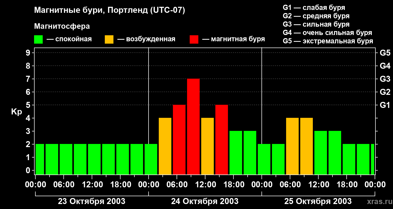 Изменения геомагнитного индекса Kp с 23 по 25 октября 2003 года для средних широт