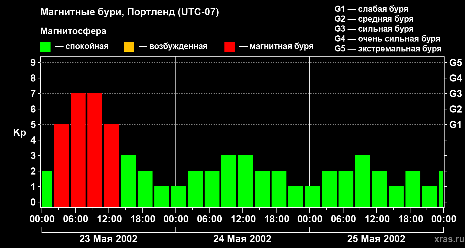 Изменения геомагнитного индекса Kp с 23 по 25 мая 2002 года для средних широт