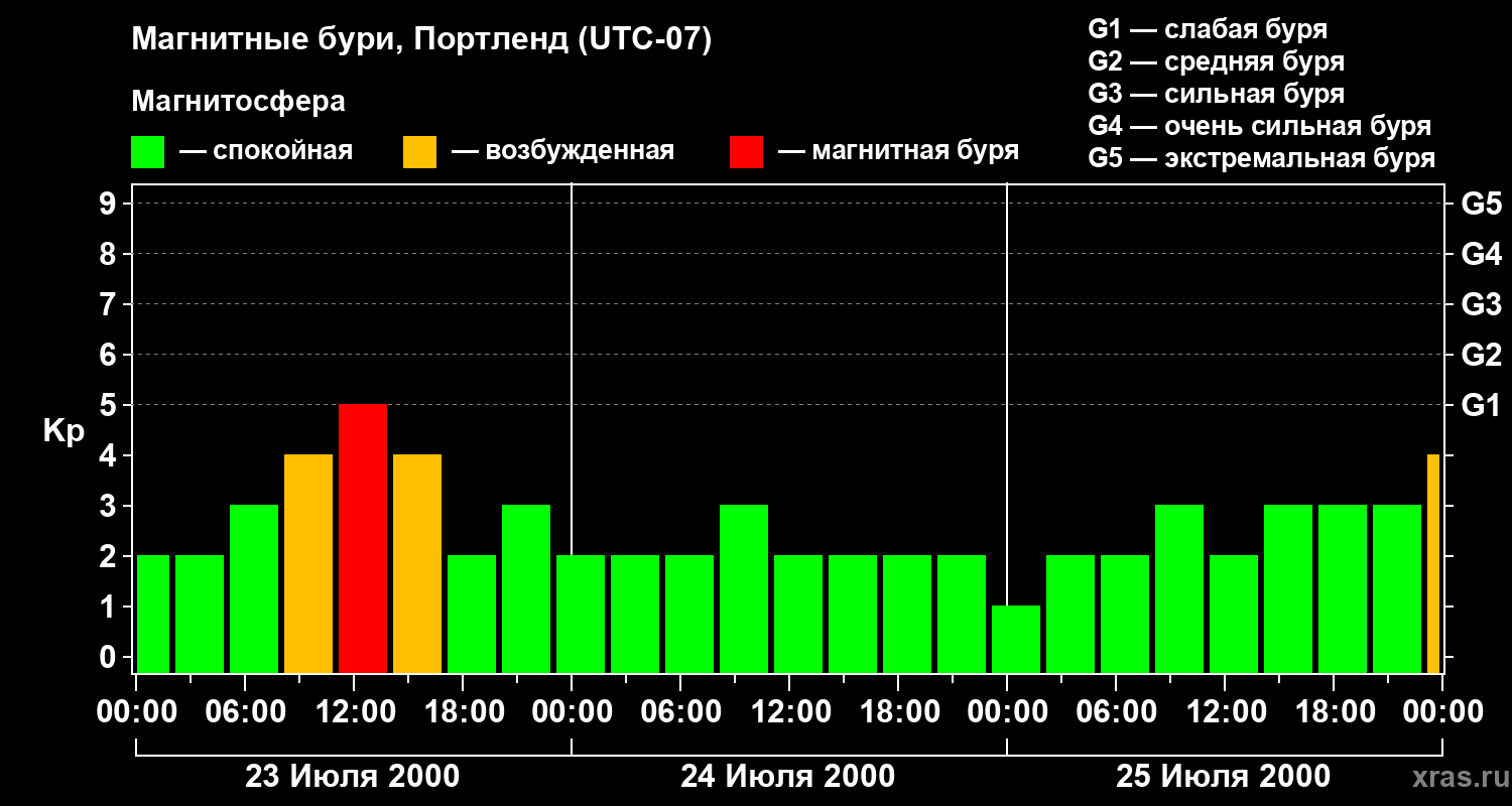 Изменения геомагнитного индекса Kp с 23 по 25 июля 2000 года для средних широт