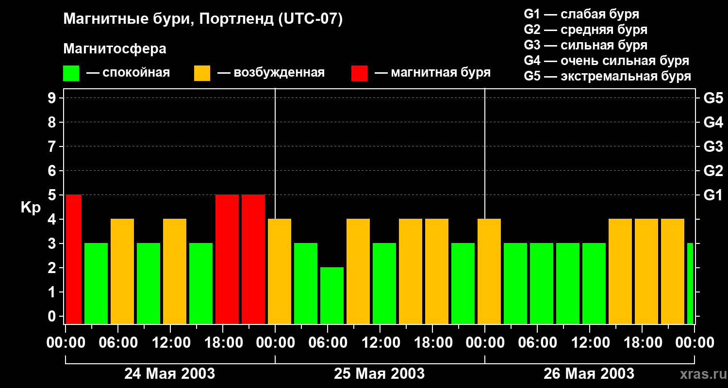 Изменения геомагнитного индекса Kp с 24 по 26 мая 2003 года для средних широт