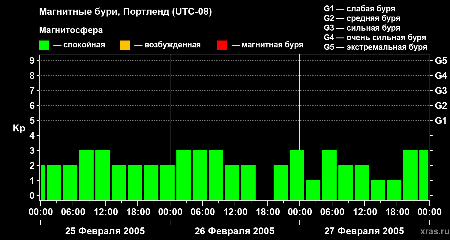 Изменения геомагнитного индекса Kp с 25 по 27 февраля 2005 года для средних широт