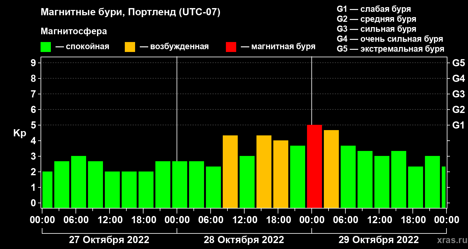 Изменения геомагнитного индекса Kp с 27 по 29 октября 2022 года для средних широт