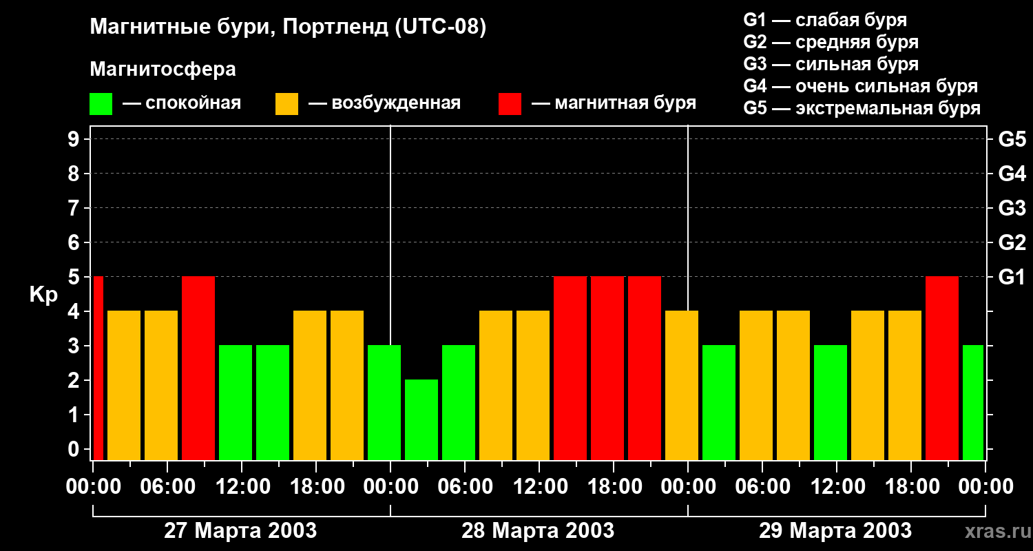Изменения геомагнитного индекса Kp с 27 по 29 марта 2003 года для средних широт
