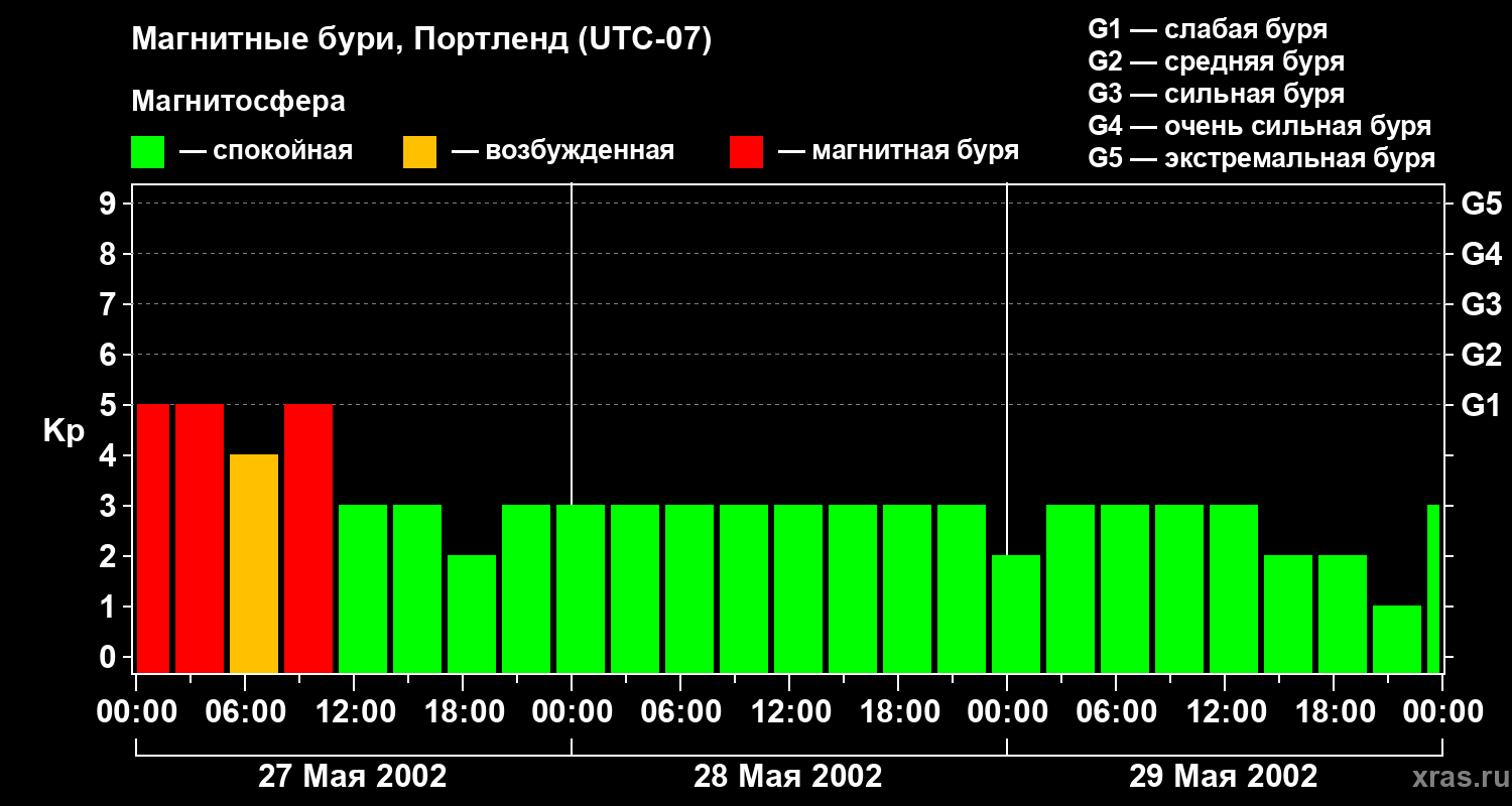 Изменения геомагнитного индекса Kp с 27 по 29 мая 2002 года для средних широт
