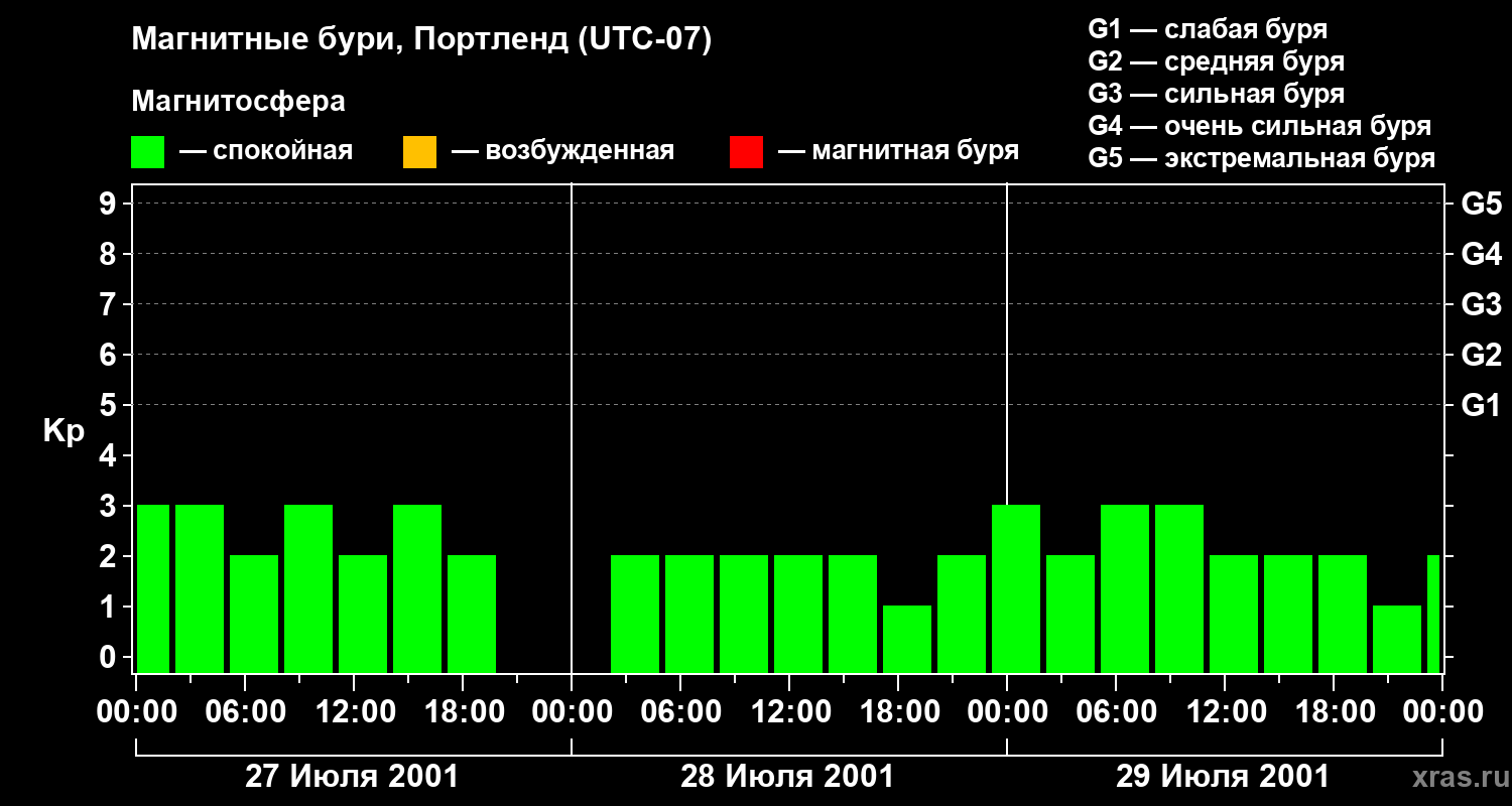 Изменения геомагнитного индекса Kp с 27 по 29 июля 2001 года для средних широт
