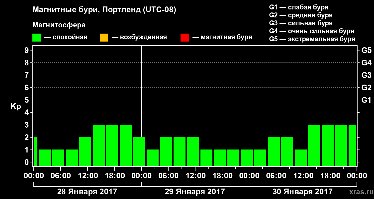 Изменения геомагнитного индекса Kp с 28 по 30 января 2017 года для средних широт