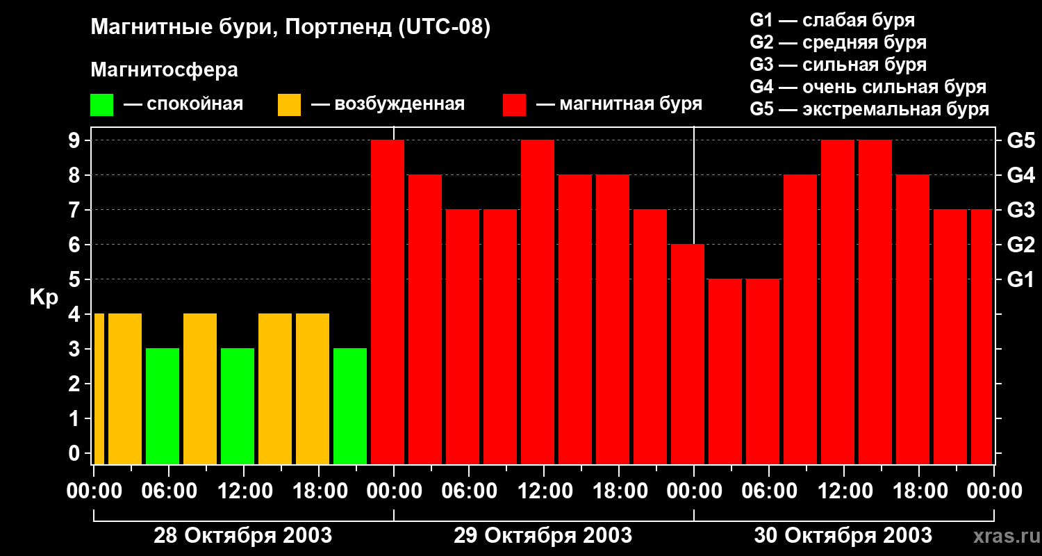 Изменения геомагнитного индекса Kp с 28 по 30 октября 2003 года для средних широт