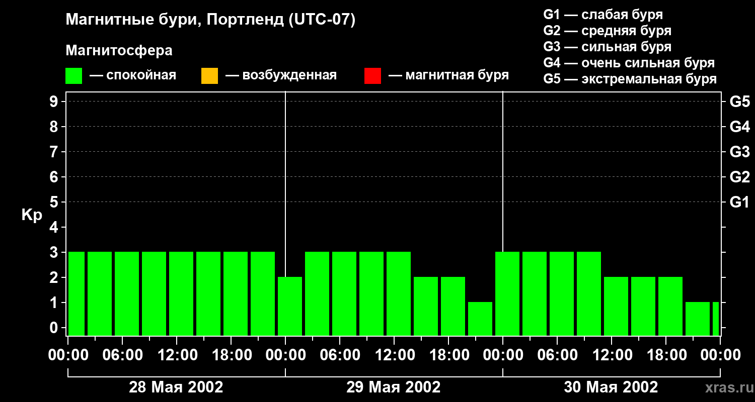 Изменения геомагнитного индекса Kp с 28 по 30 мая 2002 года для средних широт