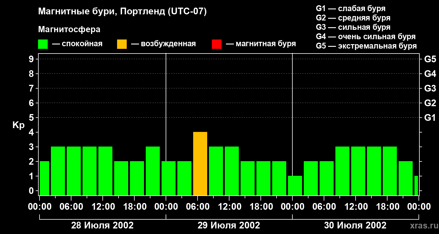 Изменения геомагнитного индекса Kp с 28 по 30 июля 2002 года для средних широт