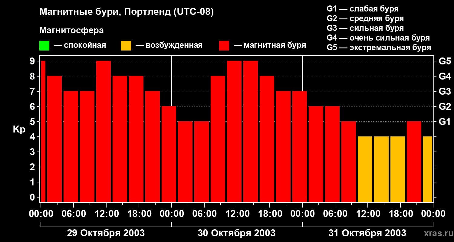 Изменения геомагнитного индекса Kp с 29 по 31 октября 2003 года для средних широт