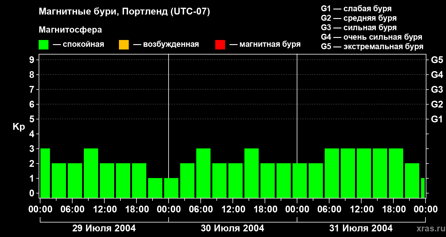 Изменения геомагнитного индекса Kp с 29 по 31 июля 2004 года для средних широт