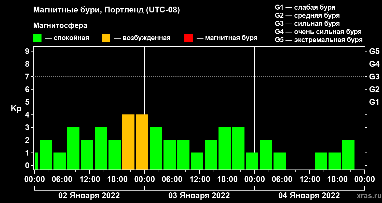Изменения геомагнитного индекса Kp с 2 по 4 января 2022 года для средних широт