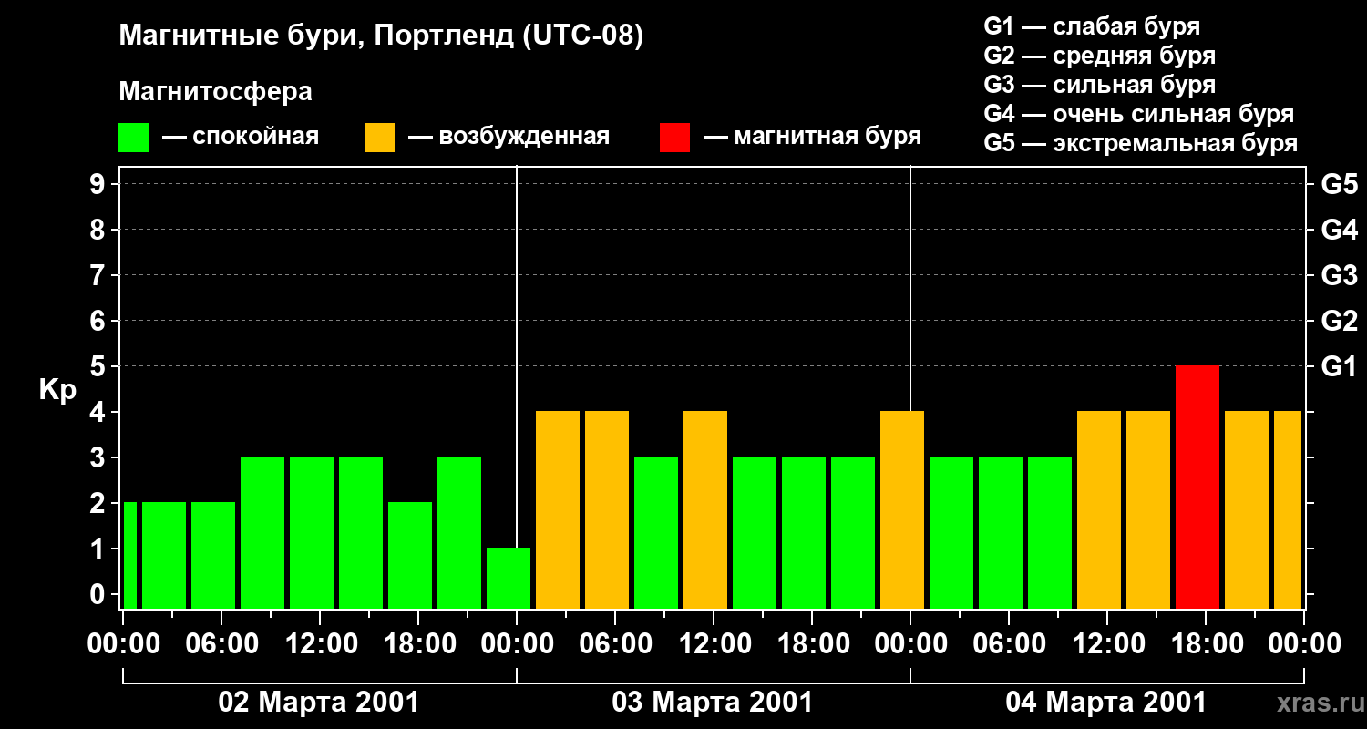 Изменения геомагнитного индекса Kp с 2 по 4 марта 2001 года для средних широт