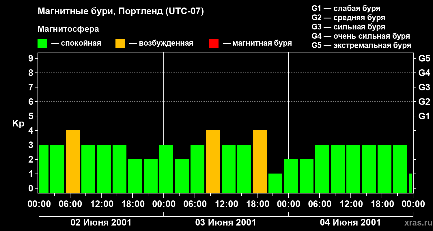 Изменения геомагнитного индекса Kp с 2 по 4 июня 2001 года для средних широт