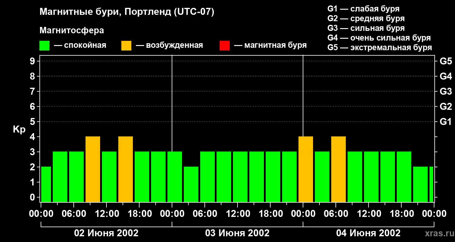 Изменения геомагнитного индекса Kp с 2 по 4 июня 2002 года для средних широт