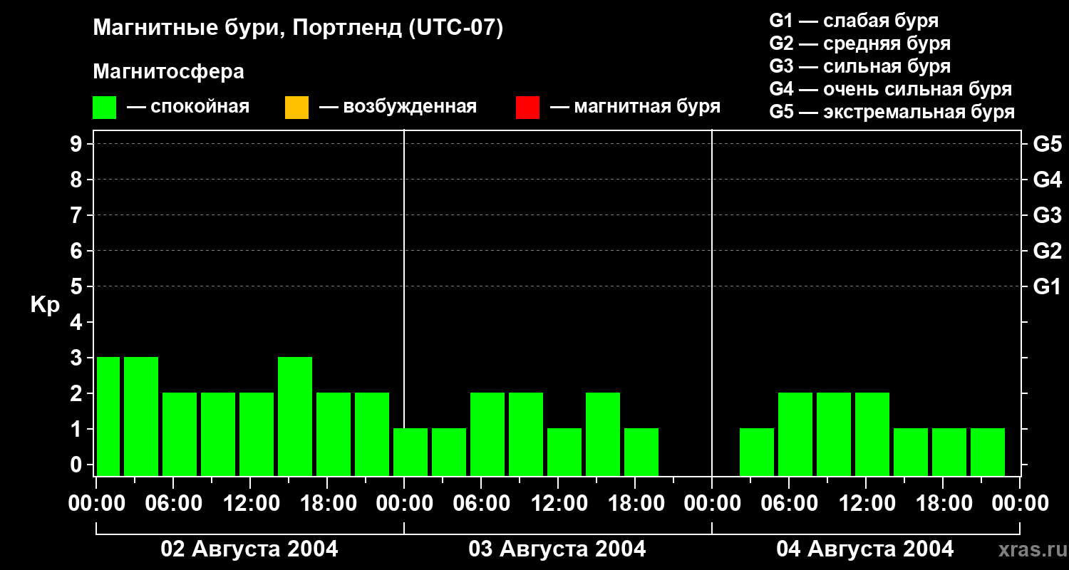 Изменения геомагнитного индекса Kp с 2 по 4 августа 2004 года для средних широт