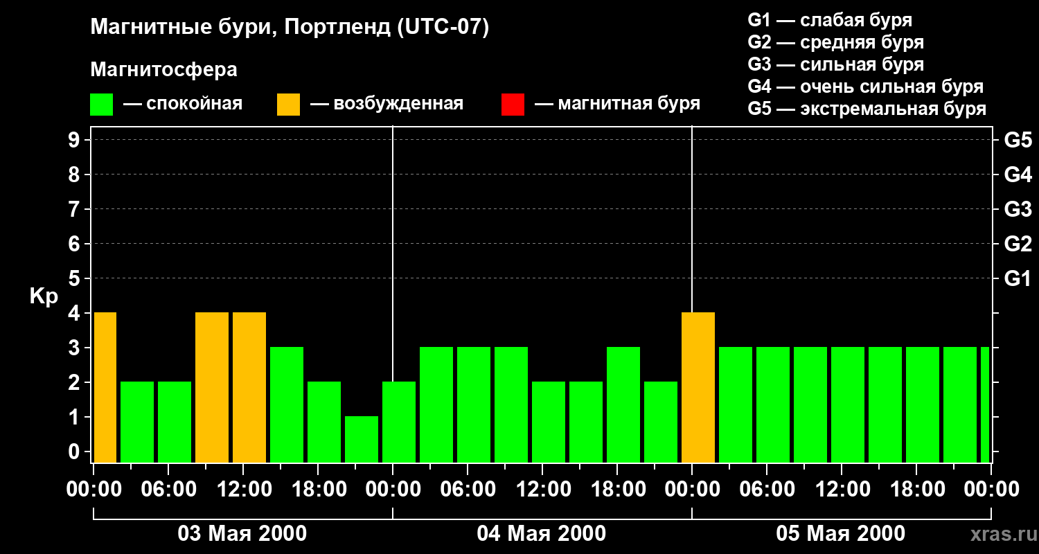 Изменения геомагнитного индекса Kp с 3 по 5 мая 2000 года для средних широт