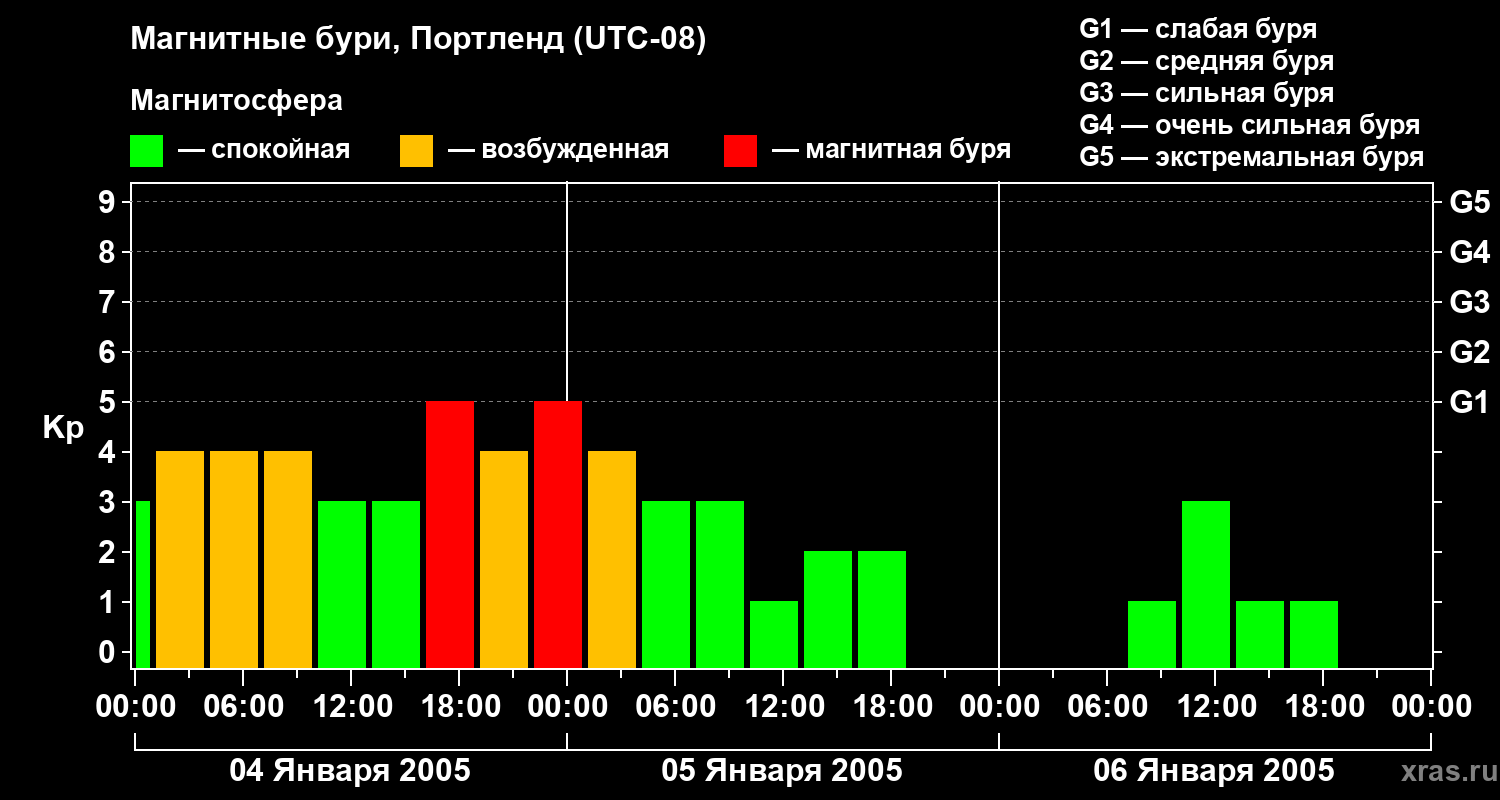 Изменения геомагнитного индекса Kp с 4 по 6 января 2005 года для средних широт