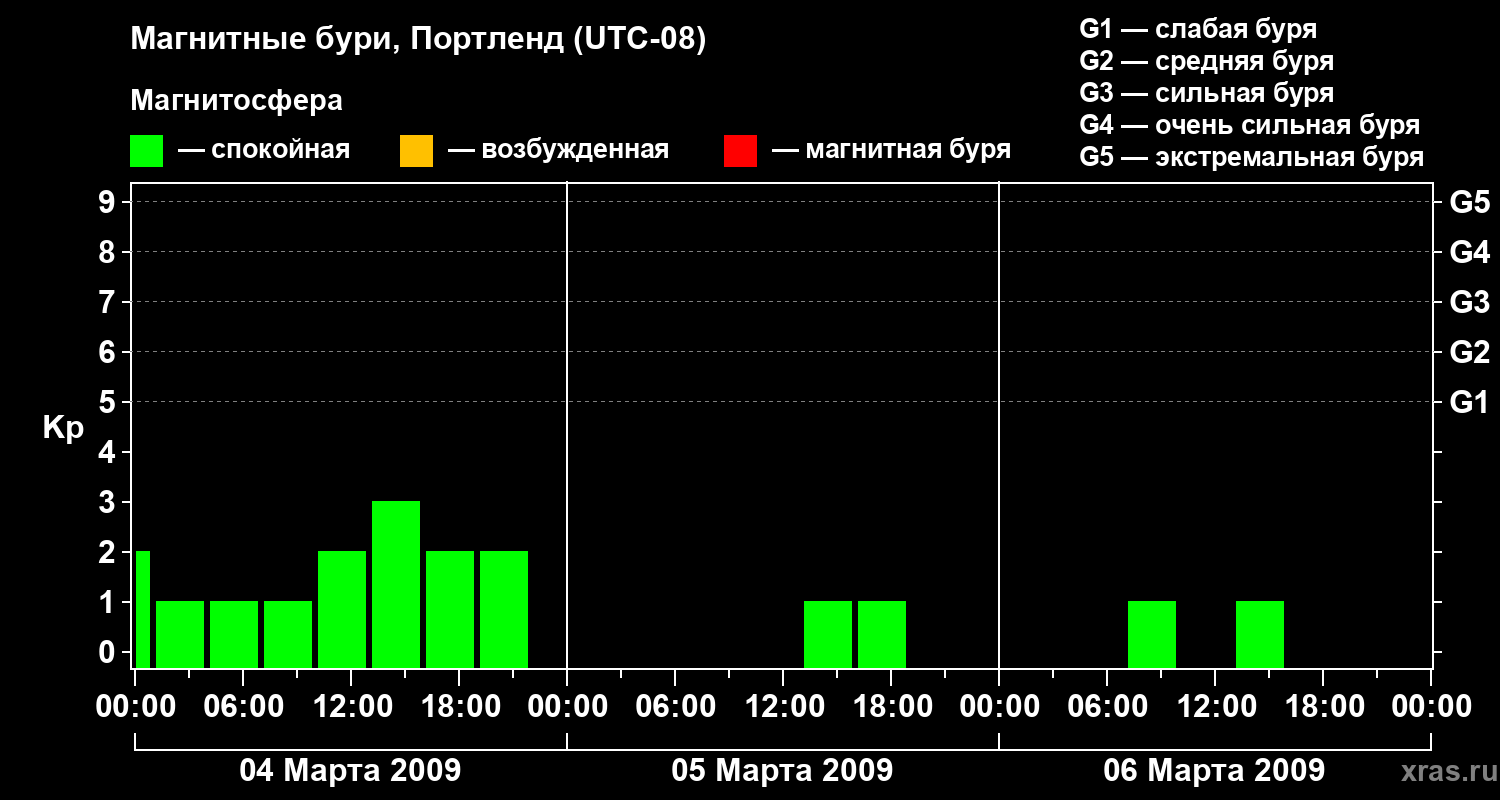 Изменения геомагнитного индекса Kp с 4 по 6 марта 2009 года для средних широт