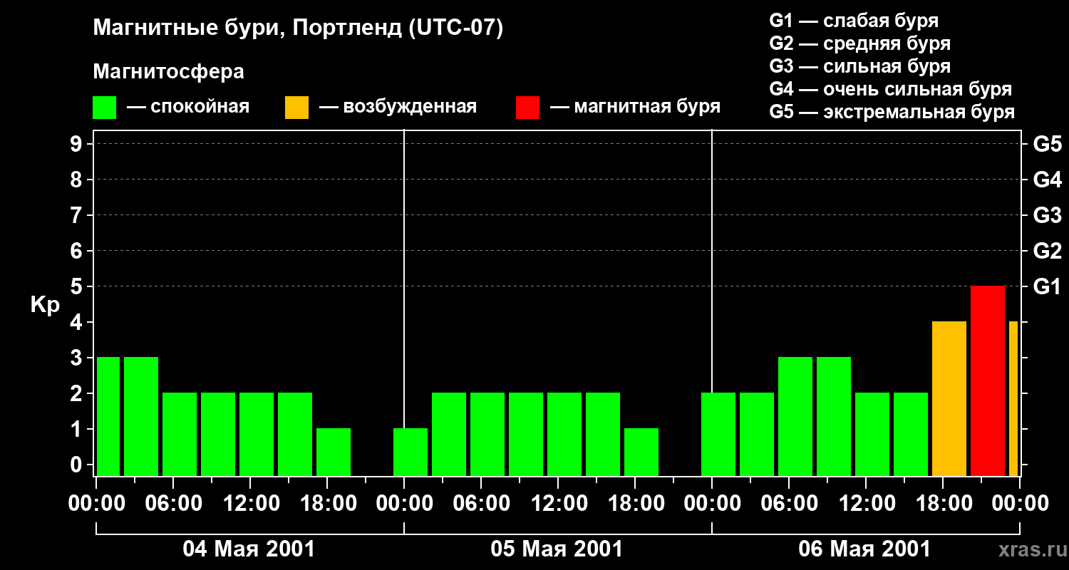 Изменения геомагнитного индекса Kp с 4 по 6 мая 2001 года для средних широт